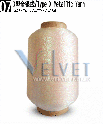 X型号是由单股金银丝切片与锦纶、绦纶、人造丝、人造棉或基它种类纱线双向抱合而成。产品高贵华丽、典雅大方,广泛用于商标,经编、织带、色织、提花布类,刺绣、毛衫、圣诞用品等。该产品种类繁多,有几百种颜色可供选择,也可根据客户来样加工。