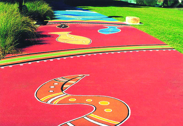 彩绘石,彩色喷涂,彩喷路面,卡通路面是一种在老的普通混凝土上进行改造的工艺。在对老的混凝土进行必要的修补和高压冲洗清洁后,在混凝土面层涂刷, 基层处理剂,把纸模或塑料模平顺地铺放于混凝土表面,使用高压喷枪把喷涂料随意地喷洒在混凝土表层。然后揭除纸模或塑料模,高压冲洗并待混凝土面层干燥后,用专用工具将保护剂喷洒或涂刷在混凝土面层,这样,本来单调乏味,普普通能的老混凝土地面就会被赋予崭新的砖石效果及各种丰富多彩的图案。主要用在各种新老混凝土道路,居家、商业及城建等各种场合所需的人行道、公园、广场、游乐场、高尚小区道路、停车场、庭院、地铁站台、游泳池等处的景观创造,校园或各种公共场合的休闲小道集散地等.各种娱乐场所的道路。