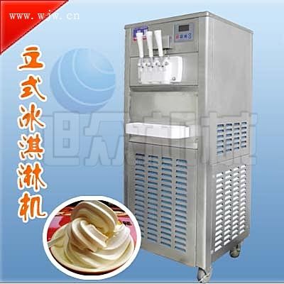 此机为三色软质冰淇淋机,机身为不锈钢外壳,三色的解释如下:以巧克力和草莓冰淇淋为例,将巧克力及草莓冰淇淋粉和水按一定比例混合均匀,倒入机器内,按下开关,机器将自动制作冰淇淋,冰淇淋做好后机器会自动停下来进入保温状态。机器有三个出料口,两侧的冰淇淋颜色分别为咖啡色(巧克力的颜色)与红色(草莓的颜色),中间的出料口为二者的混合色即咖啡色与红色的混合色,双色双口味!