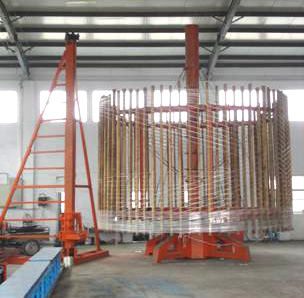 XTFW-15000数控立式现场缠绕机是我公司在吸收国外先进技术的基础上研制的国内最先进的超大直径缠绕机,专门适用于大口径玻璃钢贮罐的现场缠绕。使用适当的芯模,本机可缠绕直径4米到15米的玻璃钢贮罐。该机由可编程控制器(PLC)控制,,把所缠绕产品的参数输入进去,可自动完成产品的设计,然后控制芯模旋转与小车上下移动的复合运动,把浸透树脂的纤维按规律均匀布满在产品内衬上。该缠绕机是技术与科学的结合,诸如芯模的旋转、小车的上下移动、缠绕纱带的铺置等都是由软件通过电脑精确控制的。 二、立式现场缠绕机参数:
