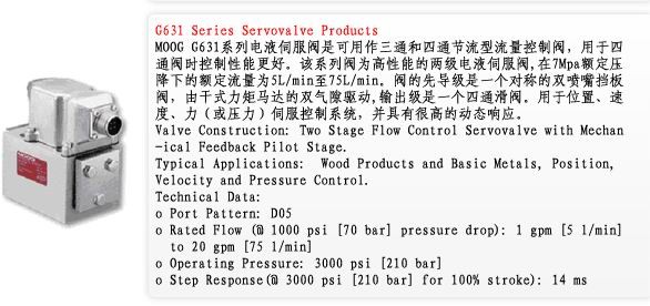 型号: G631系列 生产厂家: MOOG 产品说明: 标准响应两级伺服阀,带有可在现场更换的先导阀滤芯,并可以采用外控式先导控制压力,安装底面符合ISO4401标准。频率响应:70HZ阶跃响应:15ms流量控制:3.8-76 L/min(1--20gpm)最大工作压力:31.5Mpa此产品适用于塑料行业吹瓶机及金属压力机 我们力争以最优质的渠道,最优惠的价格,最快捷的货期,最完善的售后服务来 为您解决问题、