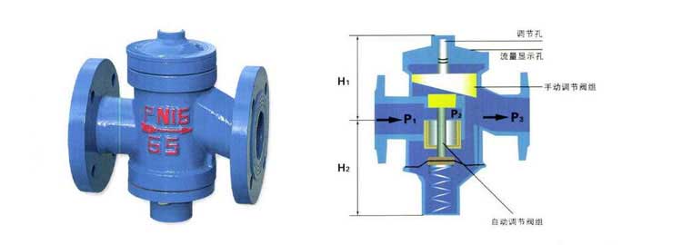 结构特点 ZL47-16系列自力式流量控制阀是按被控管线需要设定流量,并可锁定设定状态。可自动消除管线的富余压力,能使分支管线间流量调节互不干扰,直接流量数字显示,公称压力为1.6Mpa,介质温度为0-120℃,阀体材质采用灰铸铁、碳素钢、锻压铜合金,内件材质采用铜合金、不锈钢。
