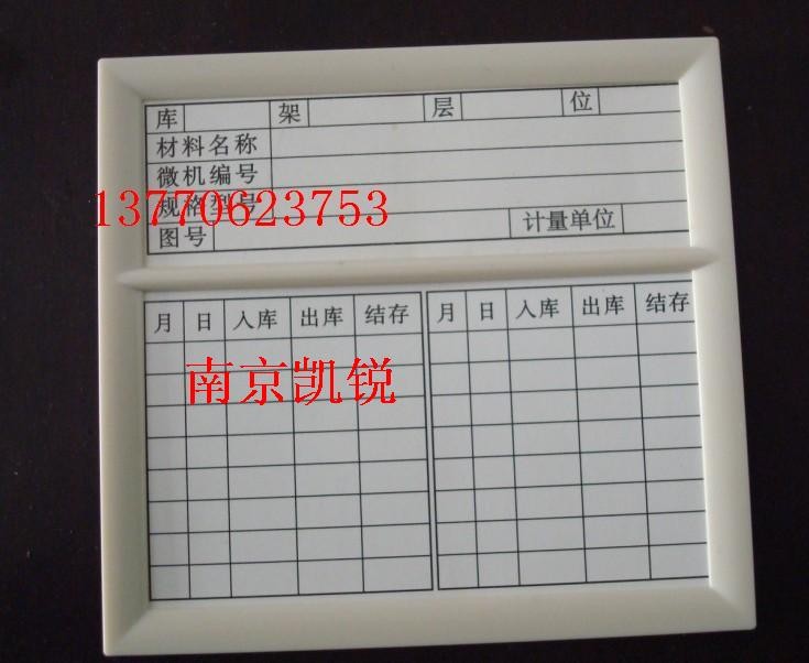 仓库标牌,南京磁性材料卡,磁性库位卡--1 3 7 7 0 6 2 3 7 5 3/0 2 5 8 5 5 6 1 5 7 5/0 2 5 8 3 3 6 4 7 2 1/1 3 3 8 2 7 6 1 7 3 6/1 3 3 8 2 0 0 2 1 8 3由ABS工程塑料制成,广泛应用于机关、部队、企事业单位的仓储管理。它背面特有的强磁材料,可以直接吸附在货架上,下部有记录库成量的转盘,规格有A、B、C、D、E、F、G、H、等,可以使它直接吸附在铁质货架上,上半部份插卡片,记录材料名称、规格、型号,下半部份转盘显示库存数量,转盘有定位,有A型、B型、C型、D型、E型、F型、G型、H型、K型,E型可以直接记录入库、出库、库存量,适用于企业的认证、升级、创一流。该产品经全国各地供电局、电厂、炼油厂、钢铁厂、造纸厂、电子企业、机械制造业、自来水公司等单位使用效果良好.--1 3 7 7 0 6 2 3 7 5 3