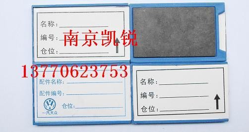 南京磁性库位卡,材料卡,南京仓库标牌,磁性标签卡,标牌--1 3 7 7 0 6 2 3 7 5 3/0 2 5 8 5 5 6 1 5 7 5/0 2 5 8 3 3 6 4 7 2 1/1 3 3 8 2 7 6 1 7 3 6/1 3 3 8 2 0 0 2 1 8 3由ABS工程塑料制成,广泛应用于机关、部队、企事业单位的仓储管理。它背面特有的强磁材料,可以直接吸附在货架上,下部有记录库成量的转盘,规格有A、B、C、D、E、F、G、H、等,可以使它直接吸附在铁质货架上,上半部份插卡片,记录材料名称、规格、型号,下半部份转盘显示库存数量,转盘有定位,有A型、B型、C型、D型、E型、F型、G型、H型、K型,E型可以直接记录入库、出库、库存量,适用于企业的认证、升级、创一流。该产品经全国各地供电局、电厂、炼油厂、钢铁厂、造纸厂、电子企业、机械制造业、自来水公司等单位使用效果良好.--1 3 7 7 0 6 2 3 7 5 3