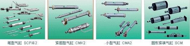 气动执行元件:笔型气缸、小型气缸、中型气缸、大型气缸、带阀气缸、薄型气缸、锁紧气缸、回转锁紧气缸、超级磁性气缸、超级无杆气缸、回转气缸、带导向气缸、汽车专用气缸、止动气缸、摆动气缸、齿轮齿条摆动气缸、齿轮齿条摆台、椭圆型活塞气缸、伺服气缸、气液转换器、缓冲器、低速大推力缓冲器、万向联轴器、气缸磁性开关、间歇回转工作台。