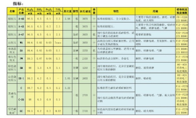 SA:为单结晶刚玉质磨粒,适用于不易研磨工件。除了一般用途,也用于热固性树脂磨粒,研磨布纸分类等。