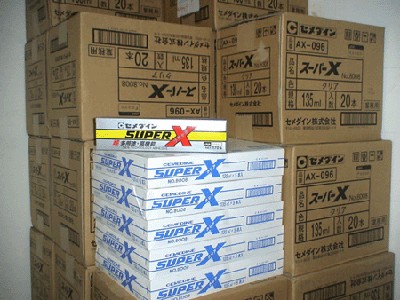 日本施敏打硬(Cemedine)SUPER X、SUPER X 8008、SUPER X 720一液型、无溶剂、速硬化、超多用途、高机能弹性接着剂。SUPER X、SUPER X 8008有白、黑、透明三种颜色,有135ml/支、170g/支和333ml/支三种包装,有AX-039、AX-040、AX-018、AX-019、AX-096等品番