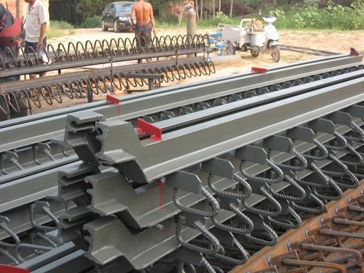 钢板式伸缩缝是用钢材作为跨缝材料,能直接承受车轮荷载的一种构造。过去,这种伸缩装置多用于钢桥,现也用于混凝土桥梁。