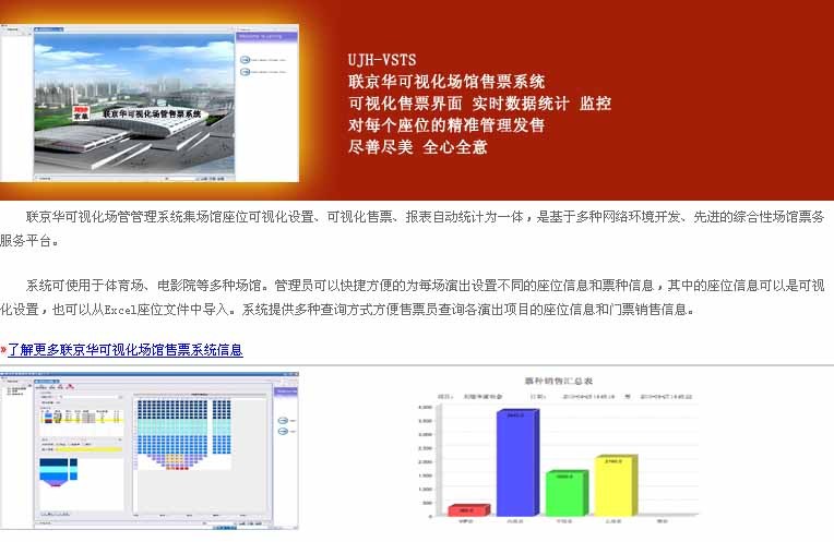 联京华可视化场馆管理系统集场馆座位可视化设置、可视化售票、报表自动统计为一体,是基于多种网络环境开发、先进的综合性场馆票务服务平台。