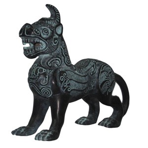 此物昂首挺胸,曲腰飞行。身饰以龙、兽之物为主,间饰流畅的各种线条。该兽取自传说中的神话故事,头上长角,两侧有翼,古人想象中的一种猛兽,有避邪,镇灾之说。