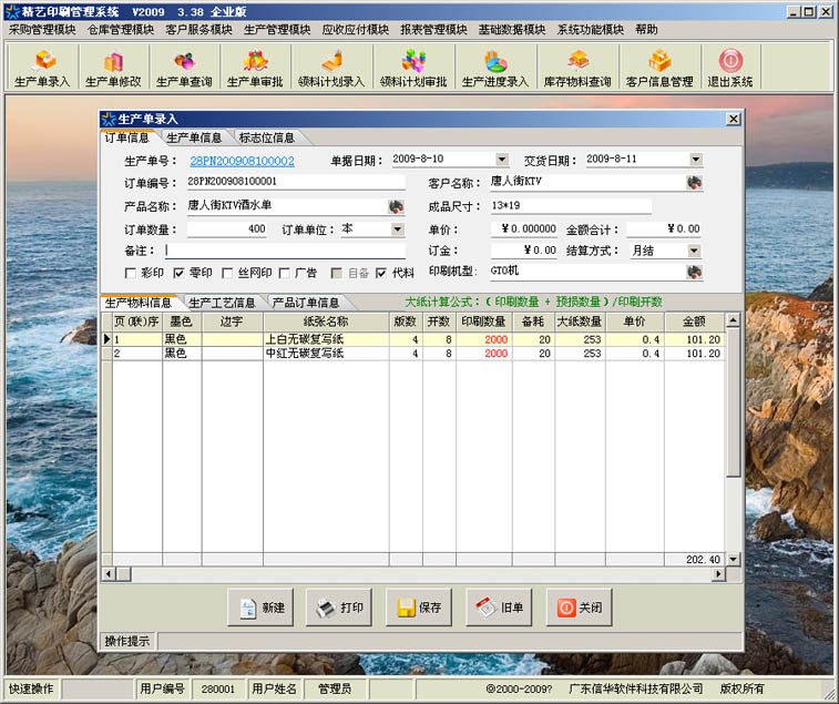 为满足印刷企业按标准化流程运转的需要,开发了一套针对方面的管理系统——《彩艺印刷管理软件》单据版,适合单据、票据、复写条、本子企业使用。
