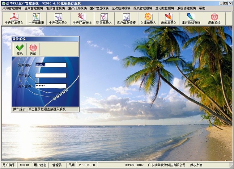 软件科技公司针对特质开发了一套简便易用的ERP管理系统——《管理系统》化妆品行业版,让企业从接单,下单,审批,物料消耗采购、领用,过程跟踪,完成入库,送货,以及所产生的应收应付业务和所有管理报表,进行全过程的规范化管理。