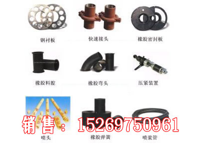 2、喷浆机配件:橡胶料腔、喷浆管、橡胶弹簧、喷头、喷头座、喷头总成、橡胶弯头、矿车轮、耐磨钢衬板、橡胶密封板、锥形套管、旋流器、压紧装置、聚氨酯耐磨衬板、齿轮、料斗、筛网、空压机、快速接头卡兰及接头座等配件