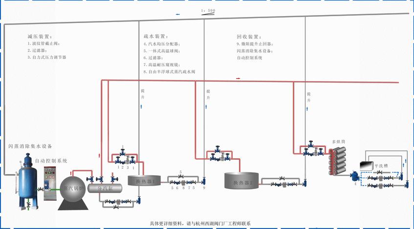 该系统的特点是:无需其它动力、投资省、水回收率高达95%以上、使用寿命长且无热污染。系统的组成:除设备上本应安装的“李氏”阀外,其余是起不同作用的阀门和管道。回水系统的运行原理是:利用疏水阀后可利用的背压及高温水在密闭管道流动时密度变化的规律,将高温水输送到锅炉房软水槽或其它目的地。无泵背压回收系统设计时,要依据用汽设备工况及具体地形条件,进行疏水阀设置及管路水力计算和设计。该系统的适用范围较广。即使用汽压力较低,只要有一定的水量,都可考虑用无泵背压回收系统。