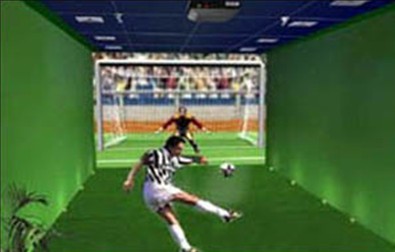 面对高清晰数字投影机投放逼真的球场画面,站在你心中敬仰的国际著名守门员前面,你可以放心的和他过上一招。把握时机看准方向,起脚怒射,守门员虽奋力扑挡,但球路刁钻,球进了!你耳边响起万众球迷震耳欲聋的欢呼声,你就是英雄!整个过程真实自然,动感刺激。反应迅速敏捷,画面引人入胜,声音惟妙惟肖,让球手身临其境,产生无比的自信与兴奋,其乐无穷。
