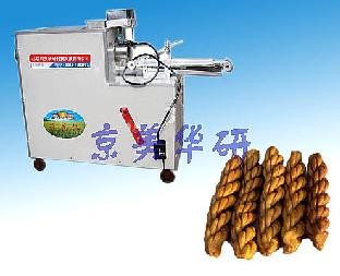 多功能麻花机该机生产大、中、小、粗、细、长、短、多股形状的各种麻花,比手工制作可提高十倍以上,并可加入10—30%杂粮(如玉米面)加工杂粮可提高营养价值,从而降低了成本、相同重量的麻花,比手工制作膨胀的大,本机操作简单,一般人员均可操作,是麻花生产厂、油炸食品店理想的致富产品、使用220V电源功率1.5千瓦,产量每小时25—30公斤,操作时放平本机,接上电源,用专用扳手上紧机头加上内齿圈,扳到锁定位置,在加油孔加入食用油,加油时每股不粘,开动电源,把和好的料放进料口,麻花从机头出来,换各种粗、细、多孔机头芯,就可以生产出各种粗细多股麻花、