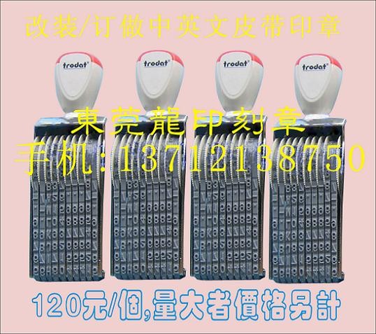 订做、改装中英文皮带转动印,编号按客户要求搭配,8位数(字带)总带宽15(毫米)印字手感极好,清晰度高。◆可订做0.5mm字体,款式齐全.每条带可以随意转动不同的数字、字母、标点符号、也可来样订做,我司有专业制作皮带技术员,转动皮带印橡胶采用进口材料,耐各种不灭印油、油墨、塑钢结钩架子、价格优惠,交货快,欢迎惠顾。◆规格列系 :D-5、D-4、D-3、通用新力皮带号码转动印章系列:◆3毫米:N-56、N-58、N-510、N-512 。◆4毫米: N-46、N-48、N-410、N-412、N-415、N-416。◆5毫米:N-36、N-38、N-310、N-312、N-314、N-310A。◆ 7毫米:N-26、N-28、N-210 。◆毫米:N-16、N-18、N-110 。11毫米: N-06、N-08 。15毫米:N-A6、N-A8 、现货充足,(备注)皮带号码转动印章每一条带上有常规标点符号,用老牌就是用好牌3、刻印章,东莞印章刻制,东莞印章制作,东莞原子印章,东莞日期印章,东莞回墨印章,东莞皮带印章