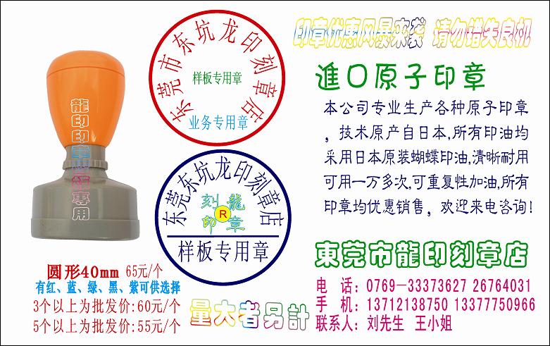 原子印特点:龙印原子印是目前商务活动中广泛应用的印章之一,属国际第二代产品,外形美观,印面清晰,无需印台、无需加油,即盖即干,携带方便,绝不褪色等特点,机器检测可以使用36000次以上。适用于:各类部门章。合同专用章、业务专用章、报关专用章及其他工作用章等。不适合银行印签印章。电子印 印迹清晰,字迹的干涸时间短,附着力强,具有较强耐水性。成品外形美观、结构合理。使用次数为2-3万次。渗透印特点:渗透印:印迹较原子印略次,自带印油,使用方便,可反复加油使用。经济耐用,携带方便。但章迹干涸时间较长,使用次数为1-2千次,并可反复注油。适用于做地址、公司名称、文件更改、邮件收发印等方面适用于:合同专用章、业务专用章、报关专用章及其他工作用章等