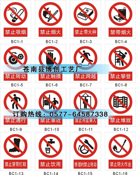 禁止吸烟、禁止烟火、禁止带火种、禁止用水灭火、禁止放易燃物、禁止启动、禁止驶入、禁止合闸、禁止转动、禁止触摸、禁止跨越、禁止攀登、禁止跳下、禁止单扣吊装、禁止入内、禁止停留、禁止通行、禁止靠近、禁止吊篮乘人、禁止堆放、禁止非机动车停车、禁止抛物、禁止戴手套、禁止穿化纤服、禁止穿戴钉鞋、禁止饮用、禁止燃放鞭炮、禁止钻杆时过人、修理时禁止转动、禁止架梯、禁止明火作业、禁止拍照、禁止混放、运转时禁止加油、禁止锁闭、禁止乱动消防器材、禁止酒后上岗、禁止跨输送带、禁止扒乘矿车、严禁酒后上岗、禁带烟火、禁止机动车通行、禁止车间乘人、禁止乘人登钩、禁止攀牵线缆、禁止料罐乘人、禁止乘输送带、禁止用汽油擦物、禁止操作有人工作、禁止使用无线通信、禁止单吊环、禁止非机动车通行、禁止鸣喇叭、禁止游泳、限速行驶、禁止攀登高压危险、禁止停车、减速慢行、配电重地闲人免进、装油场地禁止修车、禁止乱倒化学物、禁止输电路下吊装、禁止攀爬、禁止摩托车通行、严禁撞击、禁止操作有人工作、禁倒矿渣、禁做地桩、禁止抛物、禁止作业、禁倒植树、禁止烧荒、禁倒建筑、禁止拆卸、禁做牵引、禁止倒垃圾、禁止挖沙取土、禁止挖掘、禁放风筝、禁止爆破、禁止攀登、禁止私接电器