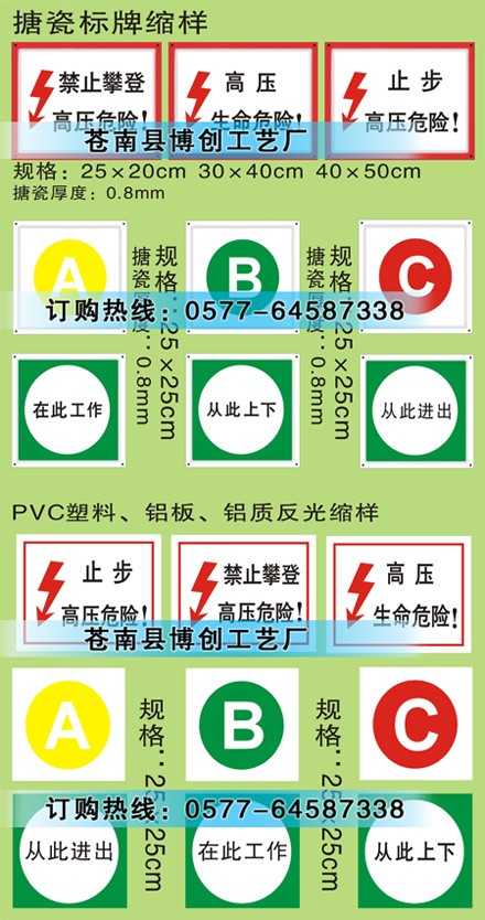 电力安全标志牌材料采用搪瓷、PVC塑料丝印、不锈钢、铝板等材料腐蚀(凹凸版)、铝板丝印、铝质反光、铝质夜光等,图案、规格按国家行业标准设计生产,也可由客户自行提供图案及规格,我厂按要求生产制作。其广泛应用于电力部门、输变电及电力设施等场所。欢迎新老客户来电订购,谢谢合作!更多产品请登录:www.cnbcbp.com