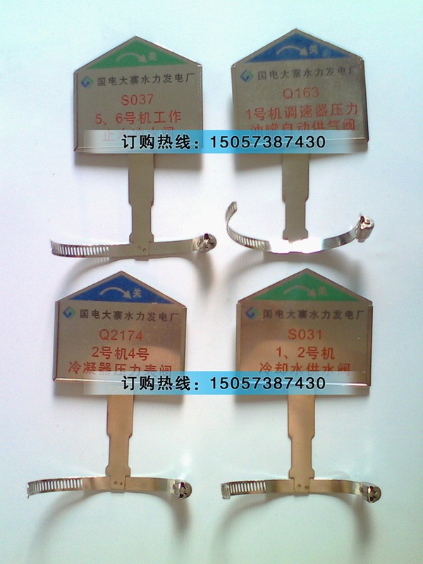 :电厂阀门设备标牌采用不锈钢腐蚀工艺制作,配上阀门支架,用喉箍固定于电厂各阀门设备上,外形美观、坚固耐用。欢迎新老客户来电订购,谢谢合作!更多产品请登录:www.cnbcbp.com