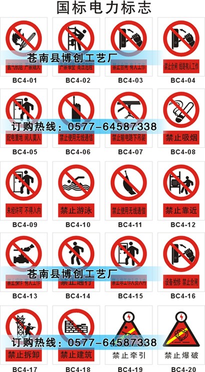 进入高压场地 必须戴安全帽、禁倒矿渣、禁做地桩、禁止抛物、禁止作业、禁止植树、禁止烧荒、禁止建筑、禁止拆卸、禁止牵引、禁止倒垃圾、禁止挖沙取土、禁止挖掘、禁放风筝、禁止爆破、禁止攀登、禁止私接电器、氢冷机组严禁烟火、禁止合闸 有人工作、未经许可 不得入内、禁止使用无线通信、注意安全、止步 高压危险、当心触电、危险注意距离、禁止抛拖锚、禁倒化学物品、禁止架通信线、在此工作、从此上下、已接地、送电、停电、设备在运行、设备在检修、完好设备、线路标语牌A B C