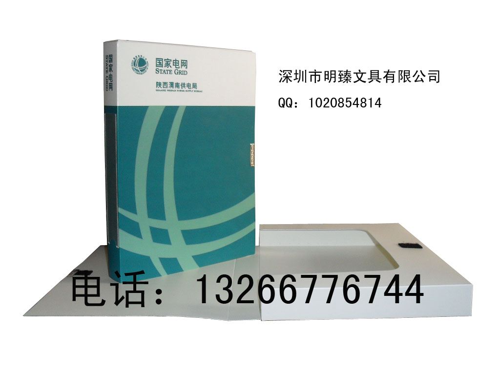 材质:档案盒采用优质环保耐用PP原材料生产,在档案盒封面丝印陕西国家电网LOGO及名称。二色,在档案盒书背处电压一透明标签袋,功能:用于企业宣传,同时用于公司内部办公文件的存档及管理。