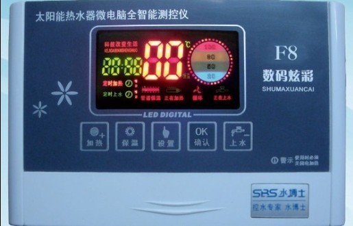 感谢您使用数码炫彩系列,f8太阳能热水器微电脑全智能测控仪是应用最新单片机技术开发而成的太阳能专用配套设备。特点:时钟显示,水温、水位超大数码彩屏显示,上水、加热实现全智能,采用人性化设计,具有水温、水位预置,低水位报警,防高温、防干烧、防漏电保护,恒温加热,二次上水,二次加热,手动控制等功能,可选增压泵自动控制或管道保温功能,适用于高品质生活的用户,使用 更方便、更安全、更实用。