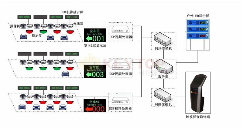 在每个车位的上方安装一个摄像机用于车位图片的抓拍,每个DSP车牌识别器(DSP Car Licence Recognition Processor)连接8台摄像机,DSP车牌识别器对抓拍的图片进行车牌识别,同时通过RS485通讯控制指示灯,红色表示车位上有车,绿色表示车位上没有车。