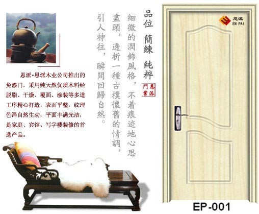 产品采用先进的生产工艺,选用优质的材料:优质老杉木龙骨架 +强化高密度板=永不变形。门扇采用850度强化MDF高密度板经过电脑雕刻造型与实木内筋复合而成,表面采用真空高温吸覆环保材料PVC波音仿真木纹皮等二十几道先进的工艺流程,经高温、高压精雕细琢而成。全方位保证了产品隔音、隔热、防潮、防蛀及抗击性能,是您放心使用的绿色环保产品。“恩派”门聚天然、时尚、现代、完美于一体 ,凭精湛的工艺,新颖的造型,典雅的风格,尽展其雍容华贵,使您的居室更显高雅品位。