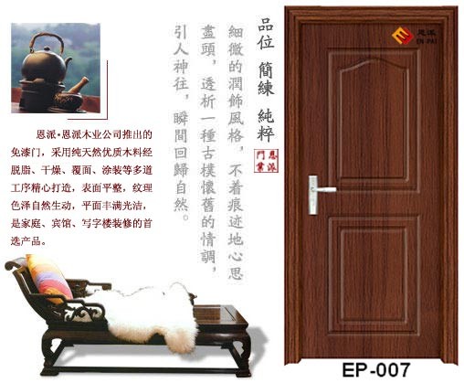 产品采用先进的生产工艺,选用优质的材料:优质老杉木龙骨架 +强化高密度板=永不变形。门扇采用850度强化MDF高密度板经过电脑雕刻造型与实木内筋复合而成,表面采用真空高温吸覆环保材料PVC波音仿真木纹皮等二十几道先进的工艺流程,经高温、高压精雕细琢而成。全方位保证了产品隔音、隔热、防潮、防蛀及抗击性能,是您放心使用的绿色环保产品。“恩派”门聚天然、时尚、现代、完美于一体 ,凭精湛的工艺,新颖的造型,典雅的风格,尽展其雍容华贵,使您的居室更显高雅品位。