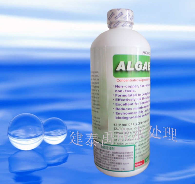 池壁、池底长藻的最佳克星,超强聚合四级铵盐除藻剂,无泡沫,不混浊,不含量重金属,不会产生池体着色,对泳客绝对安全,使用时请配合氯霸臭氧粉,并保持ORP650mv以上可使绿藻隔于夜消失。