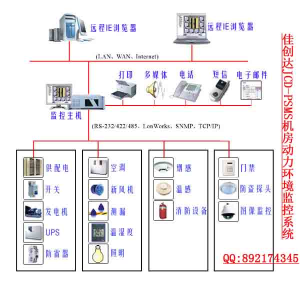 JCD-PSMS8.0机房环境监控系统是一个综合利用计算机网络技术、数据库技术、通信技术、自动控制技术、新型传感技术等构成的计算机网络,提供的一种以计算机技术为基础、基于集中管理监控模式的自动化、智能化和高效率的技术手段。其监控对象是机房内动力设备及机房环境。建设机房环境监控系统对充分利用人力资源,加强维护支持手段的建设,保障设备稳定运行和机房安全,提高劳动生产率和网络维护水平,实现机房从有人值守到少人或无人值守,促进机房维护现代化具有积极的促进作用。