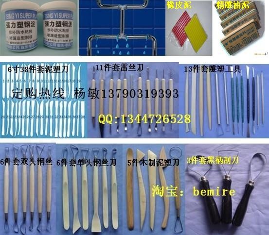 13件套雕塑工具:包括:大中钢丝刀各一(用于整体塑造出大形); 小钢丝刀两把(用来雕细节); 舌形刀两把(有不同大小和弧度的刀头,压、刮都可以); 压平刀具一把; 锥形刀具一把;切割刀一把;四把黄杨木质刀具,刮、碾、切都可以。咨询:13790319393 QQ:1344726528