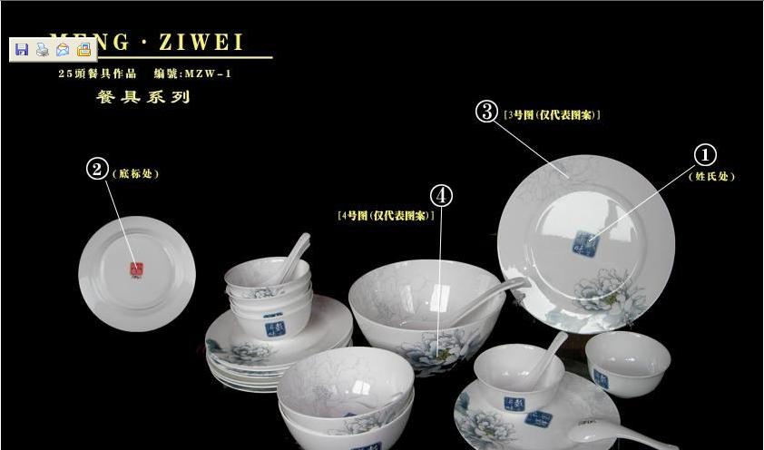 配置:4.5’金碗6头、小调羹6头、8’平盘4头、8’汤盘4头、6’澳碗2头、大汤碗1头、10’平盘1头、大调羹1头