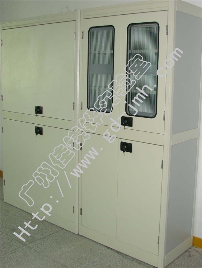 全钢结构;1.0mm厚冷轧钢板制作;上镶嵌玻璃对开门,下为钢制对开门,外表环氧树脂粉沫喷涂;不锈钢合页,闪电锁;内置三层活动层板
