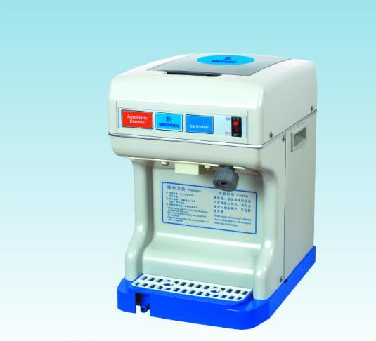 使用说明 1. 打开刨冰机盖,用干布擦净刨冰漕,检查刀片安装是否牢固。 2. 检查电源线及插头有无破损、漏电现象,接触是否良好,关闭开关,插上电源。 3.将刨冰机盖打开,投入适量的冰块盖上盖。 4.按下刨冰机前端的启动开关。 5.根据需要调整刀刃调解柄即可加工各种粗细不同的刨冰。 6.使用冰块直径在4-5cm为最佳,也可将大块冰砸成小块使用。 注意事项 1.须使用单相220V的电压。 2.刨冰机盖有安全防护装置,如未盖上盖即使按下启动开关刨冰机也不会启动。 3.请置于平整的地方,冰块投入要均匀,否则会引起机身振动。 4.投冰量控制在刨冰漕内红边上线1厘米以下。 5.刨冰漕内只能用抹布擦洗,不可用水清洗 6.每日刨冰后要将刨冰漕内的水份清洁干净。 7.清洁时勿触摸刀刃,以免划伤手指。 8.请勿随意拆卸电动机体。