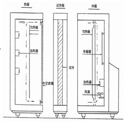 检测设备有三部分组成: 箱体、温控仪和巡检仪,如图所示。试件架用来安放检测材料,冷箱后半部分为压缩机组、控温等部件。热箱除箱体外,配精密控温仪一台,12v直流电源一台,供均热风扇用,巡检仪进行数据采集处理。巡检仪采用了最新单片机系统及高稳定度 、低漂移、低噪声的仪用放大器,同时用铂电阻为测温床传感元件,并开发了多种软件,使其精度和使用功能得到了提高与扩充构成。不仅适用于围护结构室内检测,而且可以在冬季或夏季现场测量围护结构的热工性能和热损失。