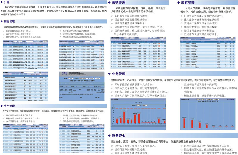 ◆ EDC生产管理软件基于互联网操作平台,采用符合技术发展趋势的WEB网页浏览方式,是一款专为生产制造业打造的企业管理系统,针对企业的销售、采购、生产、工程、品质、仓库、财务、业务、办公管理等层面提供的一套功能强大、性能完备的综合管理系统。