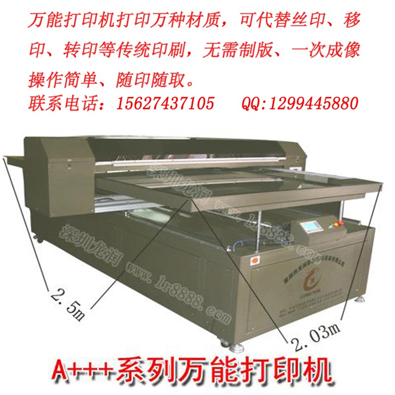 万能打印机可应用于任意材质的平面、弧面或圆柱形物体的全彩打印,具有丝印、移印、热转印等传统所无法比拟的优势,可直接在任何材质上打印各种彩色图片,文字,图形,色彩逼真,如金属,石材,皮革制品,纺织衣服,橡塑制品,布料,木制品,木制工艺品,五金标牌,陶瓷,水晶,有机玻璃,玻璃,压克力,PVC,塑料,硅胶,无纺布,玩具,不干胶,手机,铝材,U盘,工艺品等各种素材物体,只有你想象不到的材质,没有不能印制的材料。无需制版,一次成像,成本低,速度快,印刷效果永不掉色,刮不掉,防水,环保.