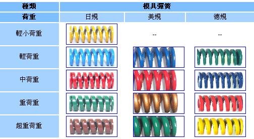 欧标模具弹簧根据负荷大小共分为四个系列:绿色代号L(轻负荷)、蓝色代号M(中负荷)、红色代号H(重负荷)、黄色代号B(极重负荷)
