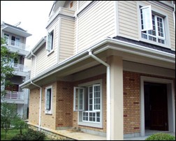 PVC外墙挂板及天沟落水系统使建筑外墙显得淳朴自然而又美观,可以抗御各种恶劣天气,而且防腐阻燃,安装简便。无论在生产过程中还是在工程实用中,对环境均不造成污染,并可再生利用,是理想的节能环保装饰材料。