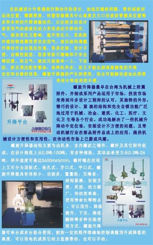 NOSEN螺旋升降器主要运用于机械升降动作调整结构中,具有独特的外形、紧凑的结构和完全自锁的功能,广泛地运用于机械、冶金、建筑、化工、医疗、文化、卫生等各行业。其多功能的组合,能准确地完成顶升、降落、推进、翻转等动作,能按一定的程序和步骤精确地进行升降定位。NOSEN螺旋升降器具有体积小、安装方便、使用灵活、动力源广、噪音低、寿命长、功能多、安全环保等特性。主要运用于:
