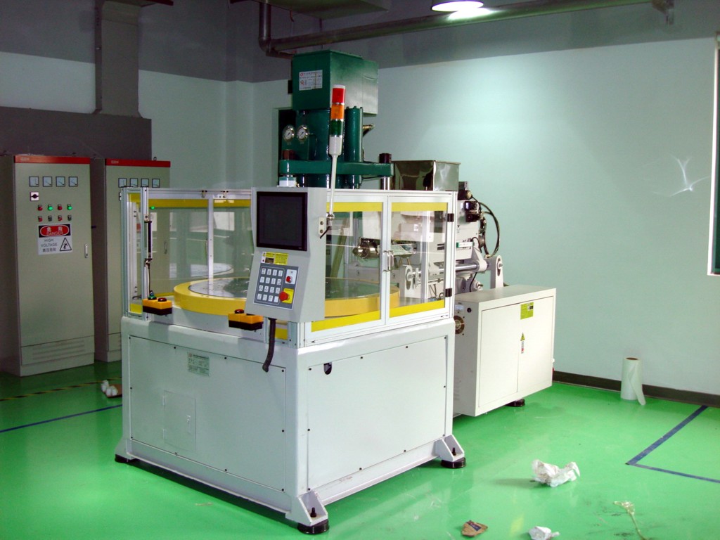 ? 圓盤機通用性能:HCV-55T-R (55Tons)3柱2站立式圓盤注塑機:直立合模直立射出方便嵌入件;多站式圓盤(1上2下模)增加產能;高效率圓盤齒輪傳動由平面自潤滑耐磨片承載;冷卻水採用中央同步運水裝置(水管可同步360度旋轉式或180度正反轉運供水裝置,完備的冷卻模具方案);旋轉快速定位準確(採用定位缸定位,定位精確度±0.02mm,未定位不合模,保護模具安全);圓盤表面鍍鉻防銹、美觀、耐用動力部分为伺服馬達系統。