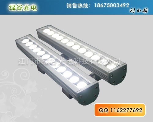 大功率LED洗墙灯是一种以大功率LED为光源,由红、绿、蓝组成混合颜色变化的投射照明灯具,可产生256灰度变化,智能控制器达到同步效果,并可接入DMX控台。用户可自己输入资料进行编程控制。该洗墙灯采用数码管地址,同时该洗墙灯内置固定程序,可实现同步、自联功能。该洗墙灯密封可靠,可调节投光角度、位置,使之处于最佳位置,达到最满意的照明效果。(缔造绿色低碳生活,选用绿谷LED灯饰)