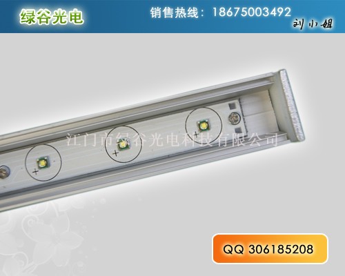 大功率LED洗墙灯是一种以大功率LED为光源,由红、绿、蓝组成混合颜色变化的投射照明灯具,可产生256灰度变化,智能控制器达到同步效果,并可接入DMX控台。用户可自己输入资料进行编程控制。该洗墙灯采用数码管地址,同时该洗墙灯内置固定程序,可实现同步、自联功能。该洗墙灯密封可靠,可调节投光角度、位置,使之处于最佳位置,达到最满意的照明效果。(缔造绿色低碳生活,选用绿谷LED灯饰)