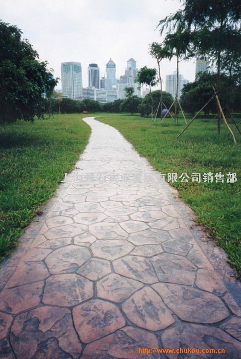 上海拜石实业发展有限公司全套引进美国专利技术、设备及核心原材料制造而成的当今国际刚流行的高科技项目----现浇彩色艺术地坪;此种材料已在上海及南方主要城市得到大面积推广,它具有一次成型、使用期长、施工快、修复方便等优点,同时又解决了普通彩色道板的整体性差,高低不平、易松动、使用周期短等缺点,是目前广场彩色砖、彩色道板的理想替代产品。该产品广泛适用于工厂(公司)园区、学校、公园、游乐场、公共停车场、广场、人行道、住宅小区、别墅等室外地坪以及其它各类休闲景观道路等。而且抗压耐磨、不变色、不粉化、经久耐用的环保绿色地坪。