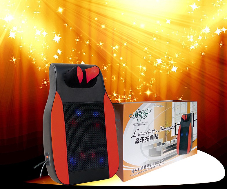 腰椎按摩师,产品特点与疗效 1、独特按摩球:四个按摩球,手法柔和合适,螺旋结构,直接作用于深层组织和,骨骼。推拿、揉捏刺激穴位及肌肉,达到缓解疲劳、酸痛,加快全身血液循环,促进新陈代谢,达到最理想的保用人性化手控器:外观精美的人性化手控器,推拿按摩速度采用无级调速不分挡数,可根据个人身体需要手动调节,推拿方向没“正转”“反转”功能。让您享受更合理的按摩乐趣优美外观造型:外观设计为枕头形状,灵巧而丰满;高档仿皮面料,经久耐用,做工细腻,精致纤巧柔性环保材料:采用优质仿皮与网布,手感柔软,细腻,柔和环保的海绵作为机芯垫,噪音低微,高性能电机,具有理想的按摩力度,增加使用时的舒适度。 安全热保护功能:本产品特有热保护的功能,当温度达到一定时,会自动停止工作保护机器,避免机器过热而引起损坏,待冷却后可以重新操作。适应身体部位:本机可以按摩颈椎、肩膀、背部、腰部、大小腿、手臂,按摩手法丰富体现了中医的揉、捏、推、搓之功效。创新性无针无药、古老而又新颖、时尚的物理疗法,是一种适合各层次人员防病、治病和自我绿色保健的好疗效。