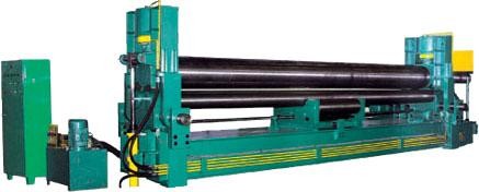 挂车用上辊万能式卷板机上辊可以垂直升降又可以水平移动,垂直升降为液压传动,通过液压缸内的液压油作用活塞杆而获得水平移动,通过蜗轮蜗杆箱、蜗轮蜗杆丝母机构传递扭矩,带动上辊的水平移动,下辊只作旋转运动为卷板提供扭矩,下辊下部设有托辊并可调节,上辊呈鼓形状,提高制品的直线度。适用于挂车各种截面形状罐体的卷制。