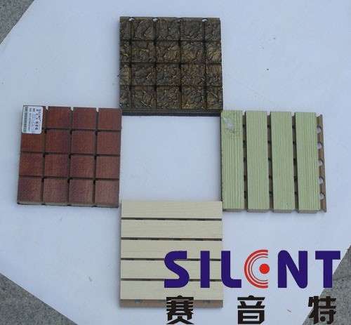 “赛音特”木质装饰吸音板是根据声学原理精致加工而成,由饰面、芯材和吸音薄毡组成。芯材为进口MDF板材,芯材的正面贴有饰面,背面粘贴黑色吸音薄毡。根据客户的要求,饰面有各种实木贴面、进口烤漆面、油漆面和其它饰面,既有木材本身的装潢效果,又有良好的吸音性能。与其它吸音板相比有独到之处,是当今国内外首选使用的装饰吸音板。